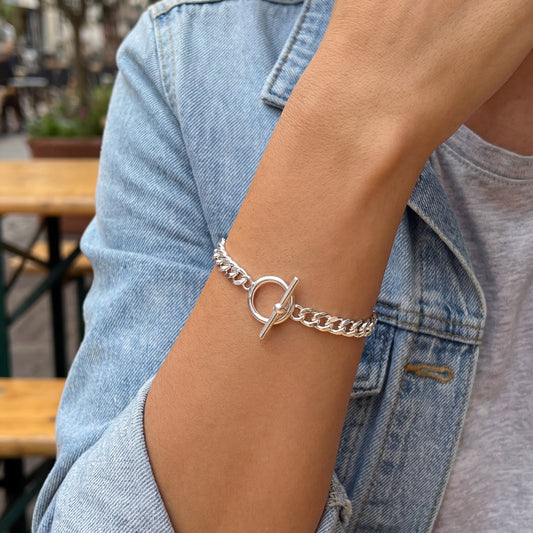 925 Sterling Silver Cuban Chain Bracelet – Modern T-Bar & Circle Fastener (19.5cm)
