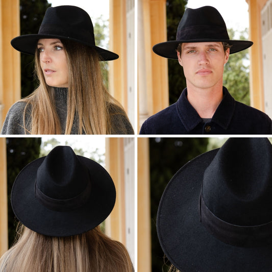 Black Felt Fedora Wide Brim Hat with Woven Braid Band – Designed in France, Made in Italy