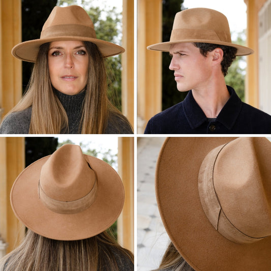 Camel Wool Wide Brim Hat with Large Suede Leather Band – Stylish & Durable