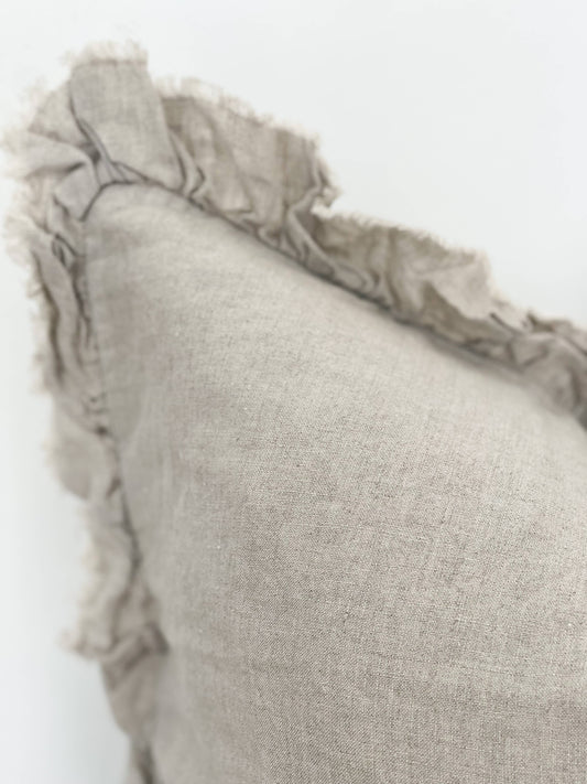 Ruffled Linen Cushion – Natural Beige | 100% Stonewashed Linen
