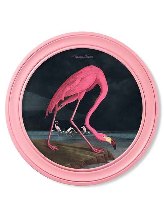 c.1838 Audubon's Flamingo - Dark - Round Frame Pink