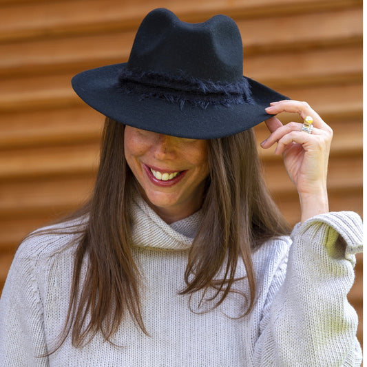 Black Wool Wide Brim Hat with Large Suede Leather Band – Stylish & Durable