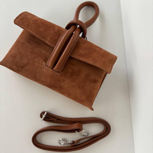 Italian Suede Leather Cuff Bag – Convertible Mini Clutch & Shoulder Bag - Tan