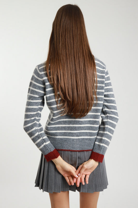 Striped Sweater-Back Button Detail–Wool and Cashmere Blend-Burgundy
