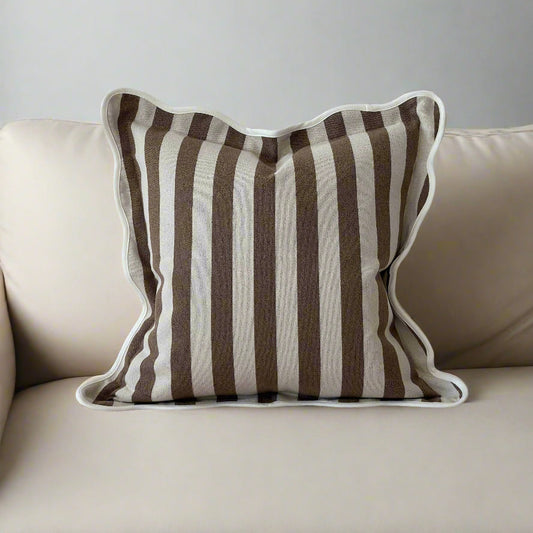 Brown & Cream Stripe Scalloped Edge Cushion with Feather Pad – 45 x 45cm