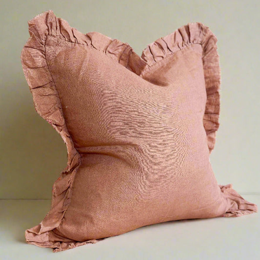 Dusty Pink Ruffled Linen Cushion with Feather Pad – 45 x 45cm | 100% Stonewashed Linen