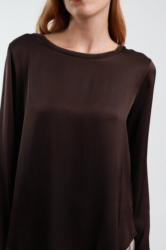 Brown Satin Blouse with Long Sleeves, Wide Crew Neck & Lurex Edge